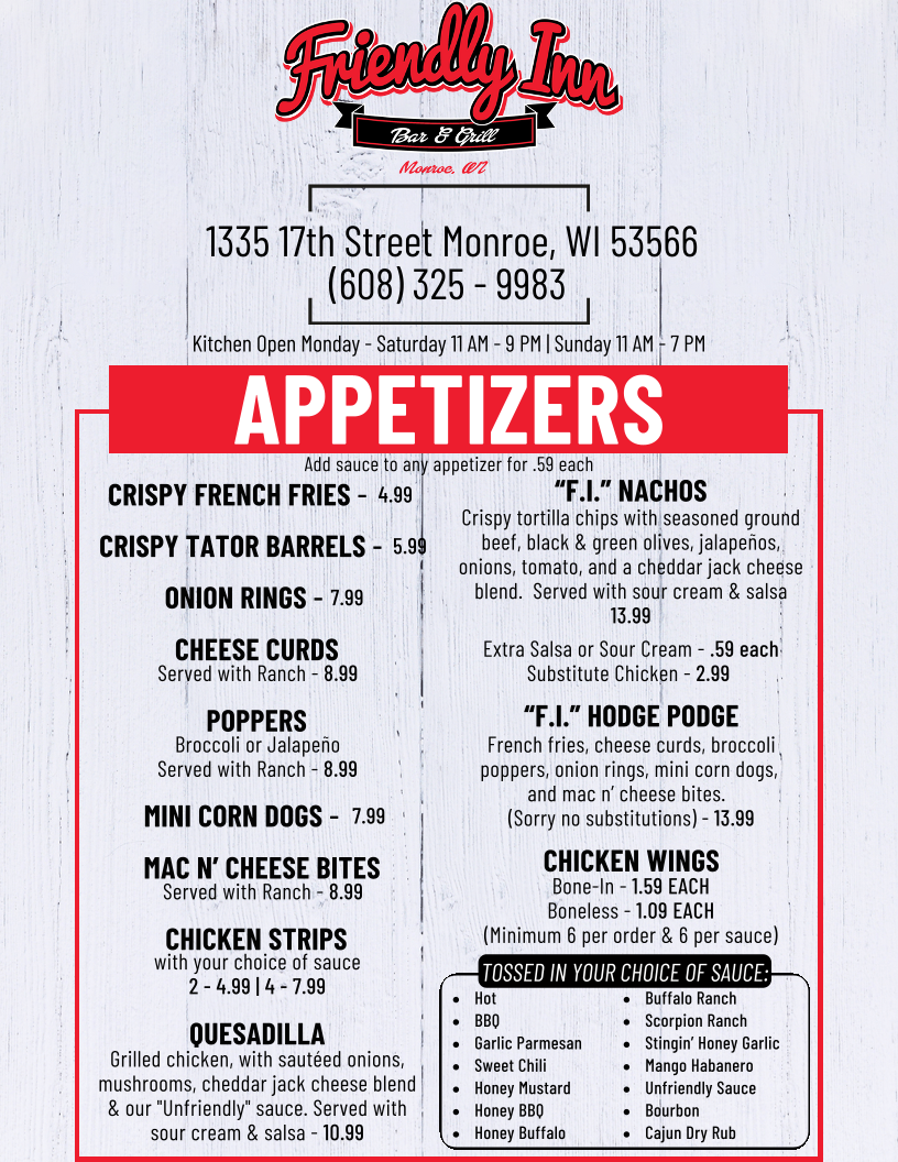 The menu at Devon's Friendly Inn offers a welcoming selection of classic bar & grill fare designed to satisfy casual cravings and complement a relaxed, social atmosphere. Featuring comforting bites like crispy chicken wings and hearty cheese burgers, it’s the kind of menu that feels just right during game nights, friendly gatherings, or laid-back lunches.